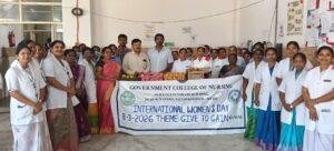 అంతర్జాతీయ మహిళా దినోత్సవం పురస్కరించుకొని నాగర్ కర్నూలు జిల్లా కేంద్రంలోని ప్రభుత్వ నర్సింగ్ కళాశాల ప్రిన్సిపాల్, అధ్యాపక సిబ్బంది సోమవారం సాధారణ ఆసుపత్రిలో రోగులకు పండ్ల పంపిణీ కార్యక్రమాన్ని డిప్యూటీ సూపర్డెంట్ డాక్టర్ వి. శేఖర్, జిల్లా వైద్య ఆరోగ్యశాఖ అధికారి డాక్టర్ కె.రవికుమార్ నాయక్ పండ్ల పంపిణీ ప్రారంభించారు. నర్సింగ్ కళాశాల విద్యార్థులు విద్యతో పాటు సేవాతత్వరత కలిగి ఉండడం మంచిదని అన్నారు. ఆస్పత్రిలోనీ పలు వార్డులలోని చికిత్స పొందుతున్న రోగులకు పండ్లను అందజేశారు. ఈ కార్యక్రమంలో ప్రభుత్వ నర్సింగ్ కళాశాల అధ్యాపక బృందం, విద్యార్థులు, ఆసుపత్రి నర్సింగ్ అధికారులు, సిబ్బంది తదితరులు పాల్గొన్నారు.