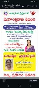 సమాజ సేవ కోసం సేవ కోసం ఎంతో కొంత మన పాత్ర ఉండాల్సిందే. అందులో తన వంతు పాత్రగా సమాజమే అమ్ముకుంటూ సేవ చేస్తున్న *అమ్మ సేవా ట్రస్ట్* కూడా అందరం సహకరించాల్సిందే. అనేక కార్యక్రమాలు చేస్తూ ప్రజల కోసం పాటుపడుతున్నారు.. అమ్మ సేవ టెస్ట్ ఈనెల 14వ తేదీన మెగా రక్తదాన శిబిరాన్ని ఏర్పాటు చేయడం జరిగింది. దీనికి అందరూ సహకరించాలని అమ్మ ట్రస్ట్ చైర్మన్ గంగాదేవి సత్య దేవి మీ అందరికీ విజ్ఞప్తి చేస్తుంది. మీరు ఈ రక్తదాన శిబిరంలో పాల్గొని సహకరించాలన్నారు. మీరు రక్తదాన శిబిరంలో పాల్గొనాలి అనుకుంటే పై నెంబర్లలో సంప్రదించాలని కోరారు .